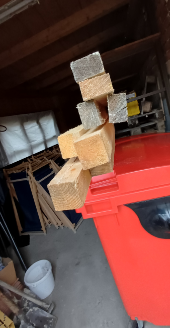 - 4 Holzbalken für die Abstützung der Frontklappe der Backofeneinhausung und ebenfalls für die Arbeitsflächen,