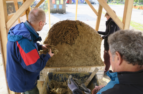 Mit dem massiven Aufgebot an Mitmachern, gleich von Anfang an, war der Lehm superschnell vorbereitet und konnte auf der letzten Strohschicht vom letzten Wochenende aufgetragen und verstrichen werden. Im Nu war die Deckschicht über dem Stroh komplett: