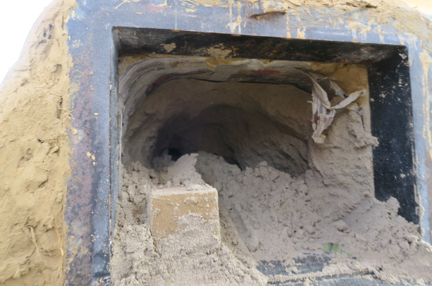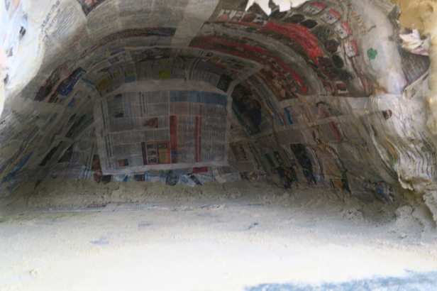 Die Zeitung hat ihre Trennaufgabe zwischen Sand und Lehm sehr gut erfüllt, nachdem der meiste Sand weg war, klebte nur noch sie noch an der Innenwand des Ofens: