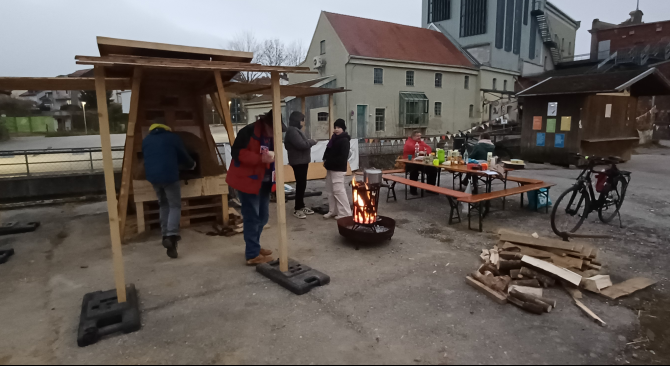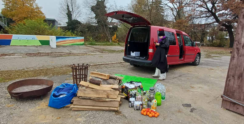 Am Samstag, 08.11.25, ging es bei kühlen einstelligen Temperaturen ans Trocknen des Lehmofens. Da die Trocknung sicher lange dauern würde, hatte Gunter ein wenig Essen, Trinken und eine Feuerschale besorgt. Um 13:00 Uhr also erstmal ausladen, aufbauen: