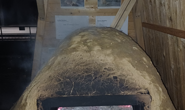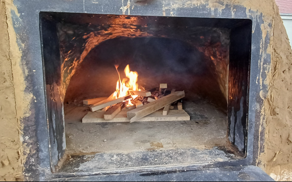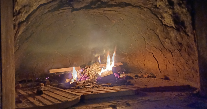 Schon wurde es etwas gemütlicher und wir haben erstmal den Backofen inspiziert (einige Trocknungsrisse außen sichtbar, aber unauffällig), dann wurde das Feuer im Ofen entzündet: