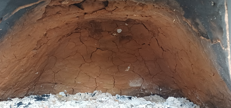 Der Ruß innen ist vollständig abgebrannt, die Wände haben eine orangene Farbe von der hohen Temperatur bekommen. Viele Risse sind sowohl innen als auch außen entstanden. Sowohl die Risse, als auch die größeren Abplatzer im Inneren sollten wir aber mit frischem Lehm wieder leicht kitten können. Außerdem sieht man, dass der Ofen noch nicht vollständig trocken ist (dunkle Flächen im Lehm außen). Die Backfläche ist ebenfalls gerissen, wie stark habe ich leider nicht genau geprüft.