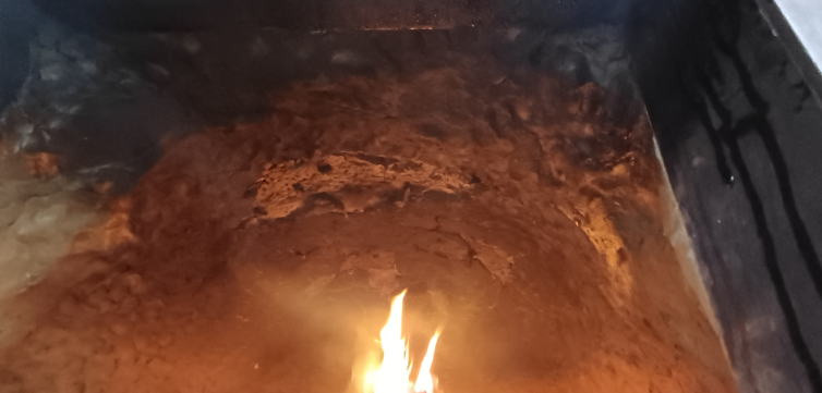 Der Lehm war anfangs immer noch ziemlich nass! Mit dem Daumen konnte man ihn weiterhin leicht verformen (innen leichter als außen) und die Feuchtigkeit war auch deutlich tastbar (innen und außen). Das Feuer im Innenraum hat von der Luftzirkulation her recht gut gebrannt, durch die Feuchtigkeit war es aber eher eine unvollständige Verbrennung. Die Innenwand wurde in Kürze kohlrabenschwarz und der Lehm hat wegen der zugeführten Hitze innen angefangen zu glänzen und richtig zu “schwitzen”.