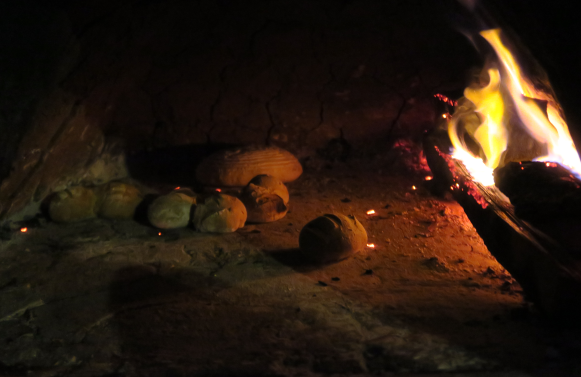 Auch wenn alle eigentlich wirklich sehr satt waren, kam dann natürlich noch die Stunde des Brotes (mit Quark) und der Semmeln, die Uli und Wolfram ausprobiert haben. Da die Temperatur nach unserer Einschätzung schon ein wenig abgefallen war, haben wir kurzerhand die verbleibende Glut am Rand mit frischem Holz gefüttert und das Feuer nochmals entfacht: