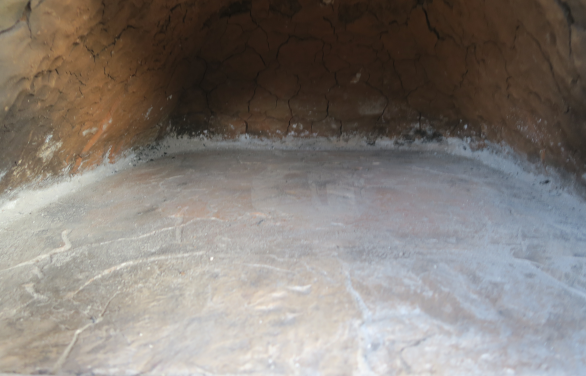 Innen ist der Ofen natürlich knochentrocken und die Backfläche ist sehr schön eben geblieben. Die Risse hier stören beim Backen nicht, aber auch diese Ritzen können wir später einmal gut ausfegen/ aussaugen und dann mit feinem Lehm auffüllen: