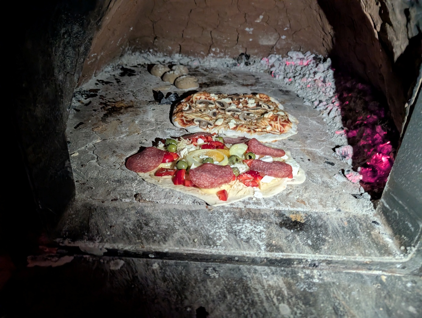 Um kurz nach 18 Uhr war dann der Hunger so präsent, dass wir beschlossen haben, dass die Temperatur des Ofens da gewiss genau richtig war und die Backfläche für die ersten Pizzen vorbereitet. Die Beläge standen schon bereit, die Pizzateige ebenfalls. Also rein mit den Pizzen, kurz Zeit gewartet, raus mit den Pizzen, geschnitten, verteilt und genossen! Und das ganze bis ca. 3 kg Hefeteig verbraucht und alle satt waren. Hier ein paar Bilder davon: