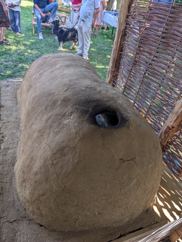 Im Steinzeitdorf Pestenacker kann man einen recht großen Kuppelofen mit Rauchabzug in Aktion sehen. Unser Ofen wird nur ein Viertel so groß.