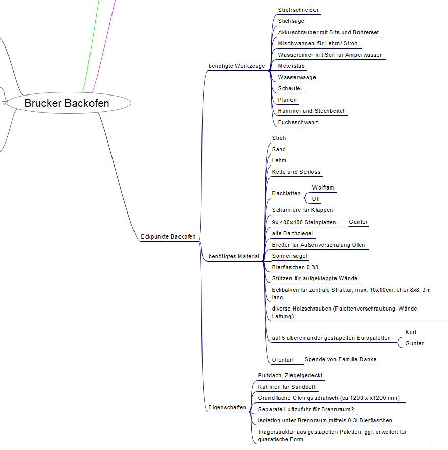 • Nach Diskussion zu verschiedenen Ofentypen, Nutzungsszenarien und konkreten Umsetzungsdetails kristallisiert sich die Ofengestalt langsam heraus. Eckpunkte sind im MindMap-Ausschnitt unten festgehalten, genauso wie eine vorläufige Sammlung von benötigtem Werkzeug und Material. Die Listen werden nach Bedarf erweitert; wer Material beitragen möchte, kann mich anmailen oder es auf den Treffen ansprechen.