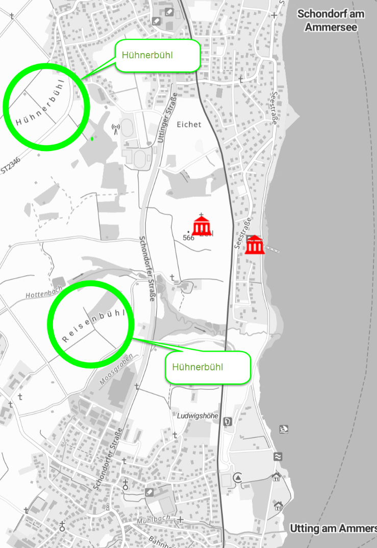 Abbildung 12 Hühnerbühl und Reisenbühl bei zwei römischen Villae Rusticae zwischen Schondorf und Utting. [Karte: Bayerische Vermessungsverwaltung. CC BY 4.0 mit Daten der und Bodendenkmalskarte des Bayerisches Landesamtes für Denkmalpflege]