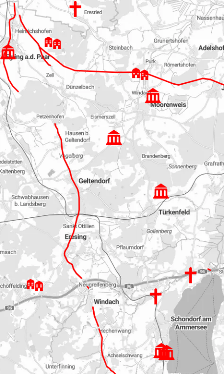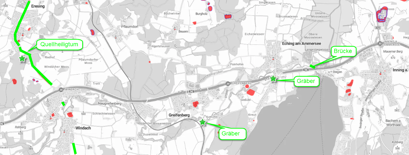 Wir sehen westlich von Greifenberg die gut belegt Römerstraße von Augsburg-Heinrichshofen-Egling-Windach-Dießen-Raisting-Wielenbach.