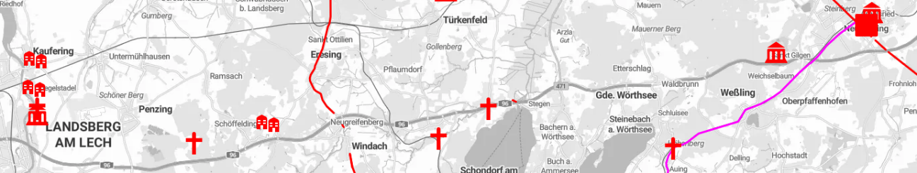 Abbildung 6 Römische Bodendenkmäler zwischen Landsberg am Lech und Gauting (die lila Strecke nicht gesichert und kein Bodendenkmal)